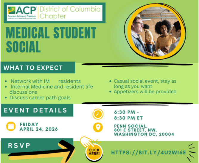 The DC ACP invites local medical students interested in Internal Medicine to their Medical Student Social on April 24 at Penn Social. Meet IM residents who can answer your questions about Internal Medicine and resident life. Attendings will also be available to discuss their career paths.