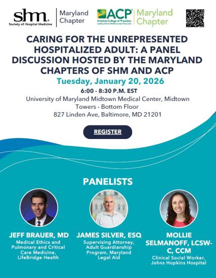The SHM and ACP Maryland Chapters are pleased to collaborate for a joint in-person meeting at the University of Maryland Midtown Medical Center, Midtown Towers. Please join the chapters to meet and network with other clinicians in your community and for a panel presentation titled Ethics Discussion: Caring for the Unrepresented Hospitalized Adult.
